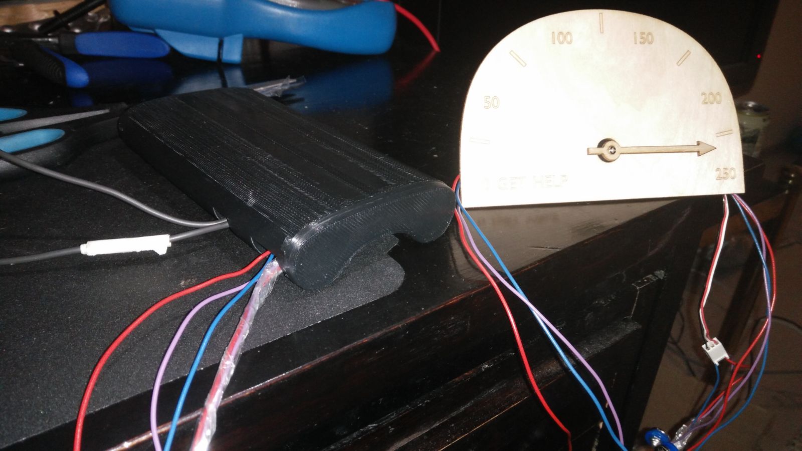 The measuring table was designed with Blender, from which the vector file was imported to Inkscape. From Inkscape the vector file was exported as a pdf and then printed using a laser cutter out of plywood. The first cut table was too thick, and the servo couldn’t be put through. The arrow needed a hole for the screw, too. That’s why the table was cut again, and it turned out without problems. The servo was glued on the backside of the table.