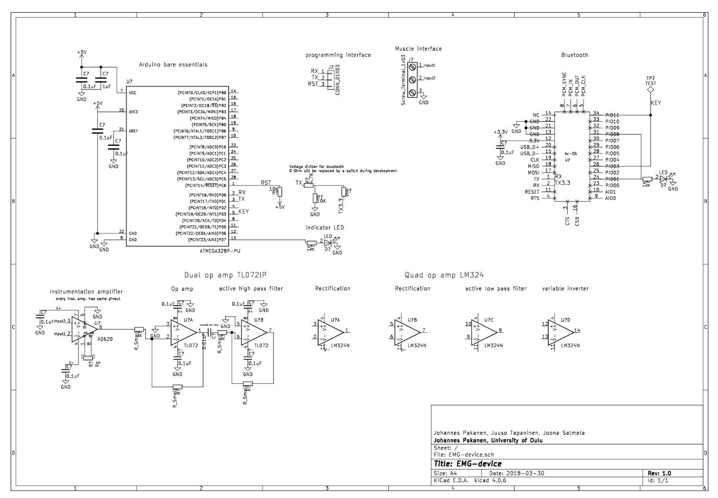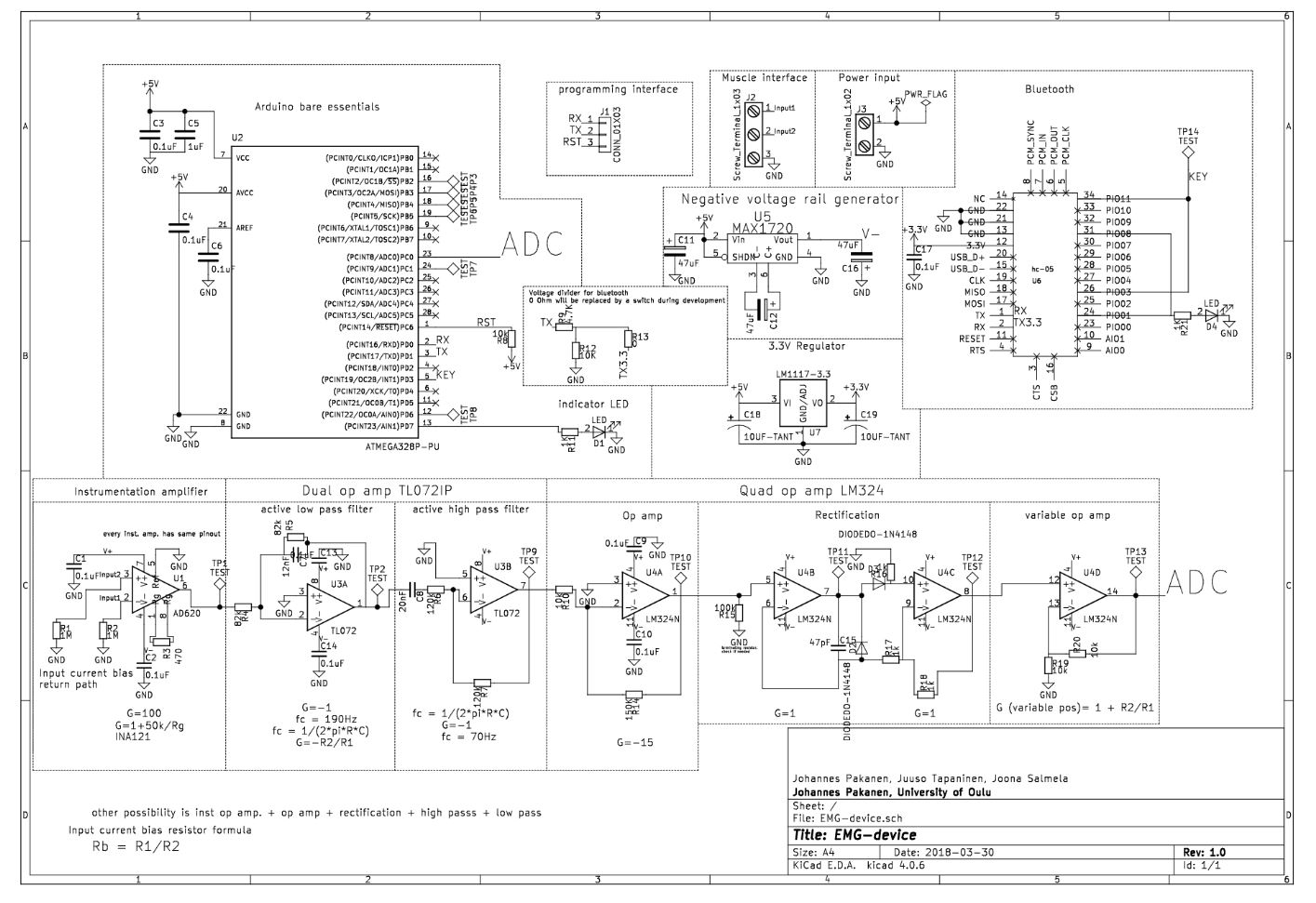 The idea is to build a device that can measure EMG signal. EMG signals are created when muscles are used, and nerve impulses are sent. Impulses create a potential difference in the order of 1-10mV which is amplified, filtered and read with an Arduino. To meet course requirements an enclosure will be 3D printed and something laser cut. We arrived at the idea of an EMG device as a combination interest to the subject of bio signals, the challenge and courses about op amps are running in parallel with this course, so we can use in practice what we have learned.