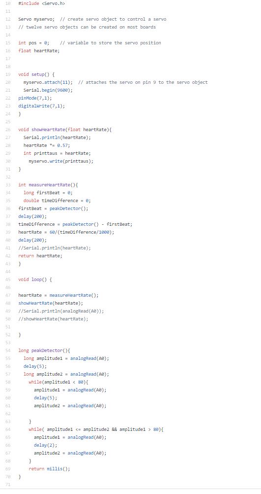 The software was done on Arduino IDE platform. We programmed our code to ATMEGA328p microcontroller using Arduino UNO. The programs purpose was to measure the time difference between every heartbeat and calculate how many times the heart beats in a minute. EKG -sensors had a triangle wave that measured voltage of the heartbeat and it had some noise in it. To get reliable data we had to calculate the time difference between every peak of the voltage signal and not take the noise into account. We made the program to measure only the rising side of the wave and its maximum voltage. That way we got the most reliable data. Then we had to program a correct angle to a servo to display the heartrate on a measuring table.