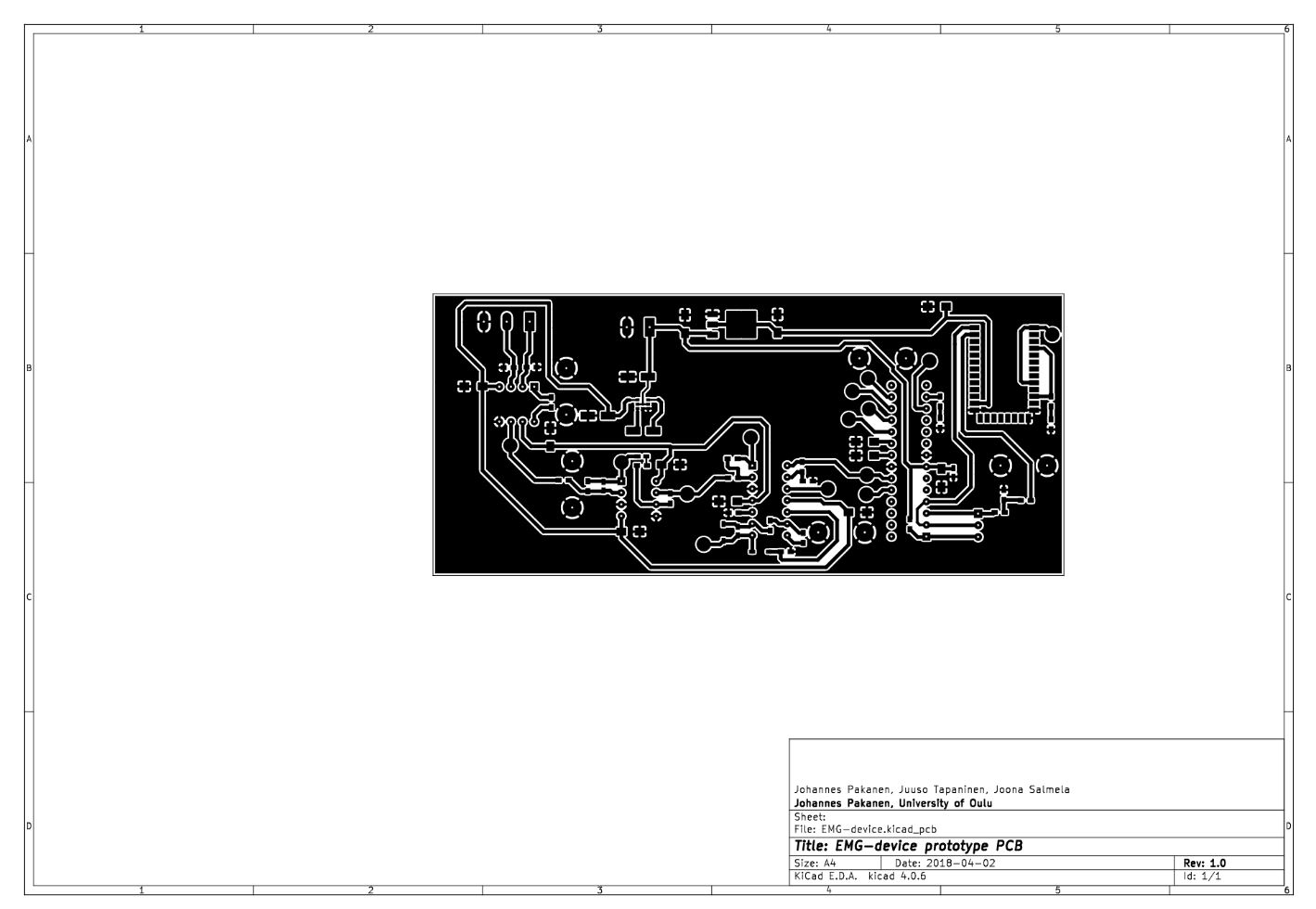 Johannes designed the circuit board using KiCad. Voltage -sensors didn’t have strong enough signal, so in order to use it properly the signal had to be amplified and filtered using operational amplifiers. The voltage difference in the order of 1mV is measured across the chest with EKG electrodes, +, - and ground. The signal to an instrumental operational amplifier, where common mode noise is rejected, and the signal is amplified. Next, the signal goes through low and high pass filters. After filtering is further amplification and full wave rectification. Last, one more amplifier and then the signal goes to the ADC of ATMEGA328p.